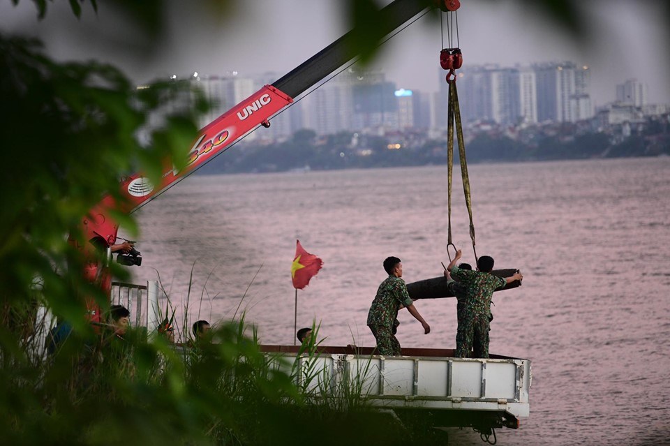 Chiều 22/6, Ban chỉ huy quân sự quận Long Biên và Bộ tư lệnh Quân khu thủ đô đã trực tiếp trục vớt, di dời quả bom ở sông Hồng gần khu vực cầu Long Biên.