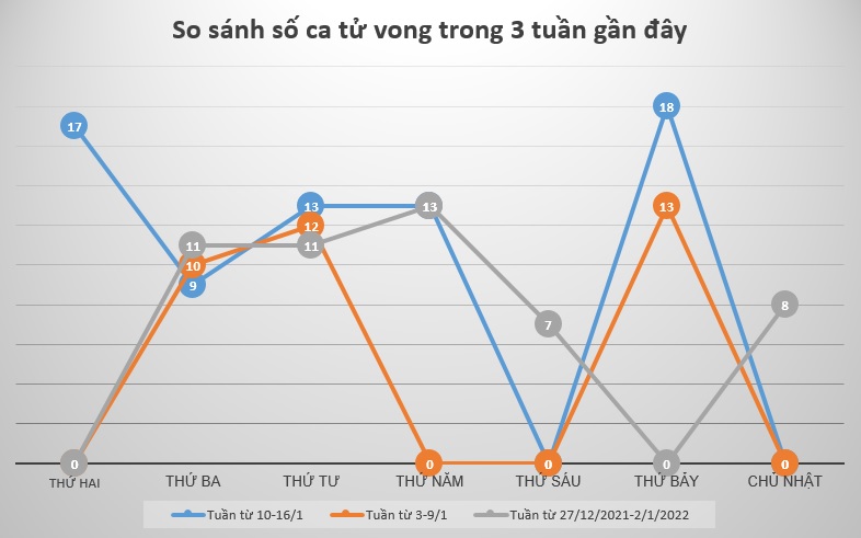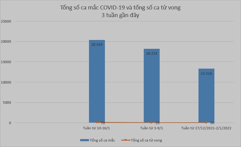 Số ca mắc mới từ 10-16/1 cao hơn so với 2 tuần liền kề trước đó. Số ca tử vong trong tuần (10-16/1/2022) là 70 ca, tăng lần lượt 35 ca so với tuần từ 3-9/1/2022 và 20 ca so với tuần từ 27/12/2021-2/1/2022.