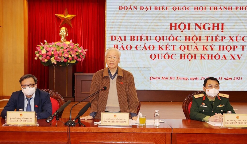 Ngày 26/11, Tổng bí thư Nguyễn Phú Trọng cùng đại biểu Quốc hội đơn vị bầu cử số 1 TP Hà Nội tiếp xúc cử tri các quận Ba Đình, Đống Đa và Hai Bà Trưng, theo hình thức trực tiếp kết hợp với trực tuyến đến 56 điểm cầu.