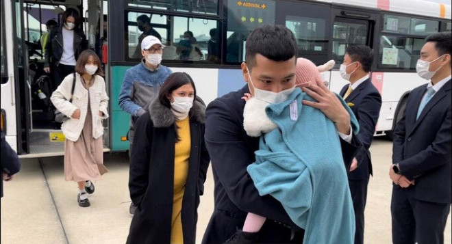 Hình ảnh tổ tiếp viên chuyến bay VN5311 hỗ trợ hành khách khi máy bay hạ cánh xuống sân bay Fukuoka