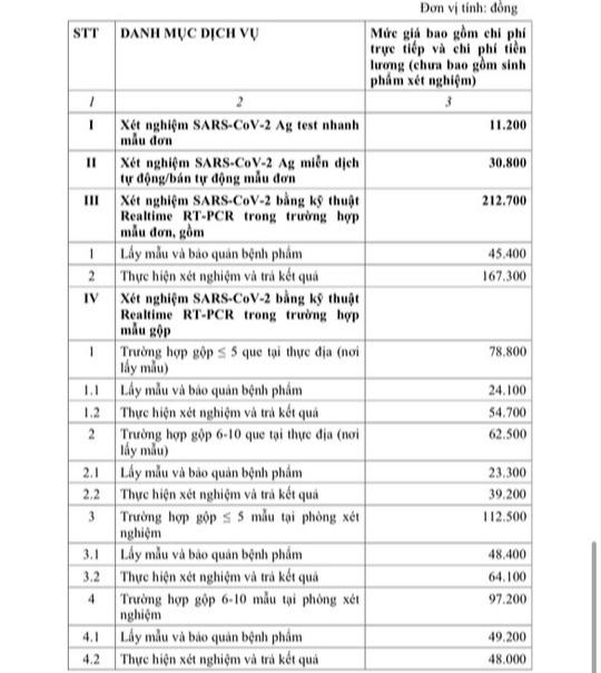 Mức giá xét nghiệm bao gồm chi phí trực tiếp, chi phí tiền lương, chưa gồm sinh phẩm xét nghiệm thấp nhất là 11.200 đồng đối với test nhanh mẫu đơn. Xét nghiệm miễn dịch mẫu đơn được áp dụng mức 30.800 đồng.