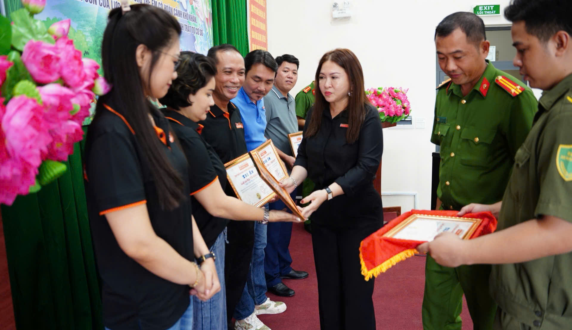 Trung tá Nguyễn Văn Tình (đại diện Ban lãnh đạo địa phương) lên trao thư cảm ơn cho tập thể các thành viên Tạp chí DN&PL
