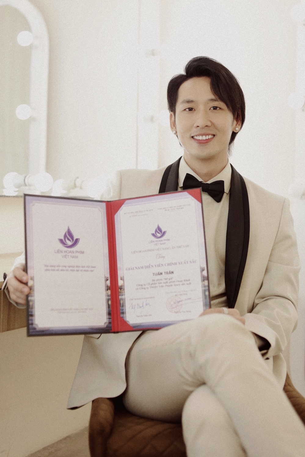 Tuấn Trần bên giải thưởng điện ảnh đầu tay tại Liên hoan phim Việt Nam lần thứ 22. Ảnh: Nhân vật cung cấp