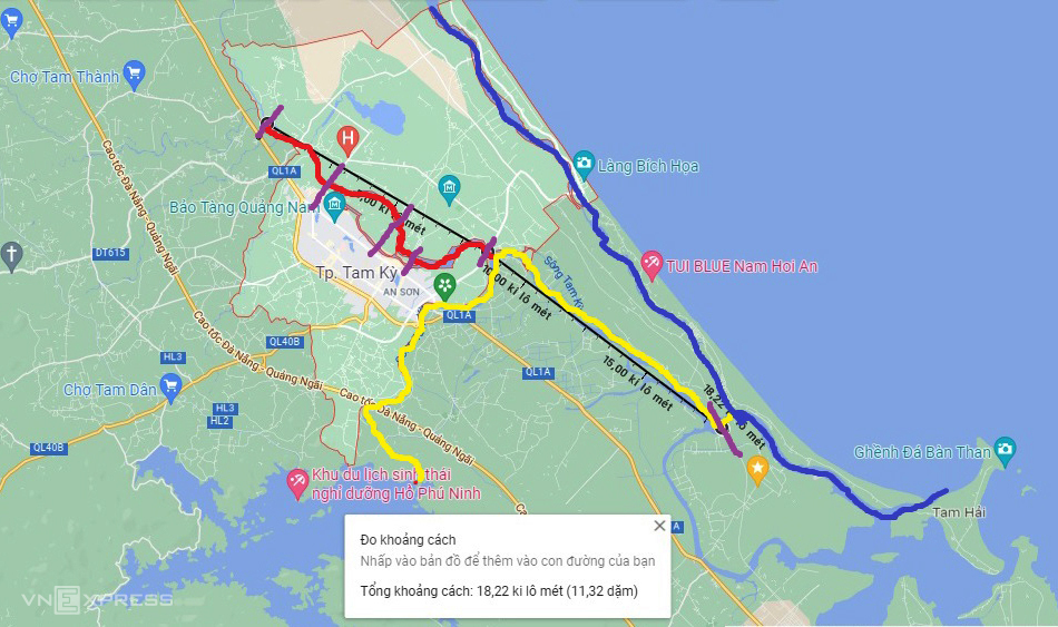 Màu vàng sông Tam Kỳ, màu đỏ sông Bàn Thạch, màu xanh sông Trường Giang và màu tím là sáu tuyến đường, cầu bắc qua sông. Ảnh: Google map