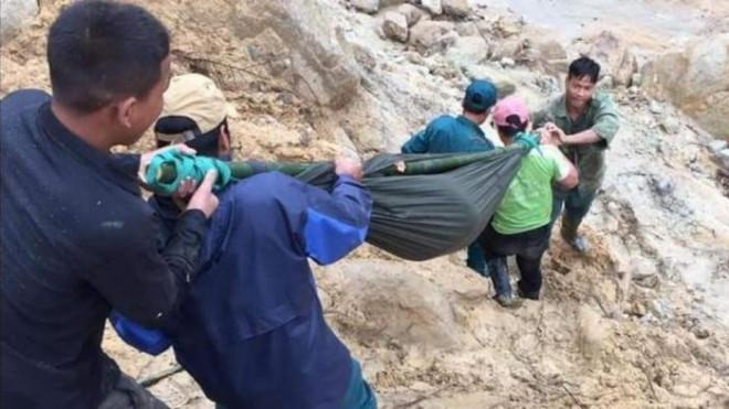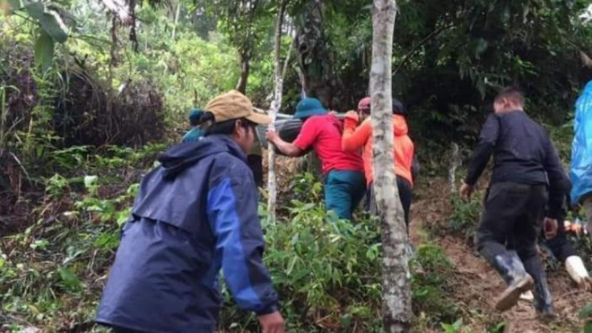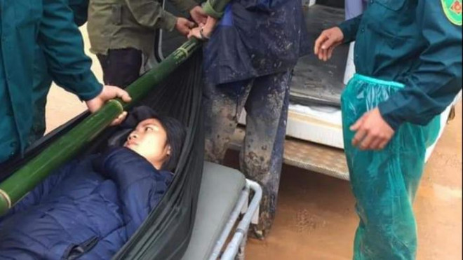 Do đường bị sạt lở, chia cắt nghiêm trọng nên lực lượng dân quân huy động thanh niên, người dân thay nhau khiêng bộ thai phụ vượt rừng núi sạt lở hơn 20km đến bệnh viện.