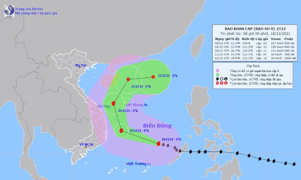 Từ đêm nay (18/12), ở vùng biển ngoài khơi Thừa Thiên Huế - Khánh Hòa (bao gồm cả huyện đảo Lý Sơn) có gió mạnh dần lên cấp 7-8. Từ ngày mai (19/12) tăng lên cấp 9-10, vùng gần tâm bão đi qua cấp 11-12, giật cấp 14; sóng biển cao từ 6-8m; biển động dữ dội.