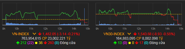 VN-Index giảm 3,14 điểm (0,21%) còn 1.482,05 điểm.