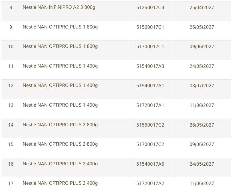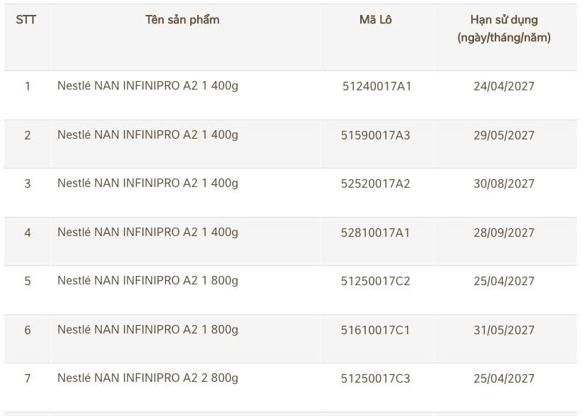 Danh sách 17 lô sữa NAN vừa được Nestlé Việt Nam thu hồi