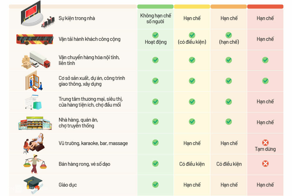 Nghị định 128 quy định các hoạt động được tổ chức theo từng cấp độ dịch. Đồ họa: Viết Tuân - Tiến Thành