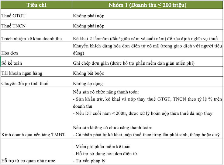 - Nhóm 1: Doanh thu ≤ 200 triệu