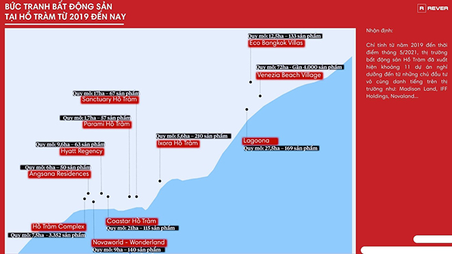 Theo tổng hợp từ Rever, tính từ thời điểm đầu năm 2019 đến quý 2/2021, thị trường bất động sản Hồ Tràm đã chứng kiến sự ra mắt của khoảng trên dưới 11 dự án bất động sản với tổng quy mô lên đến hơn 1.000ha, cung ứng cho thị trường hàng ngàn sản phẩm bất động sản.
