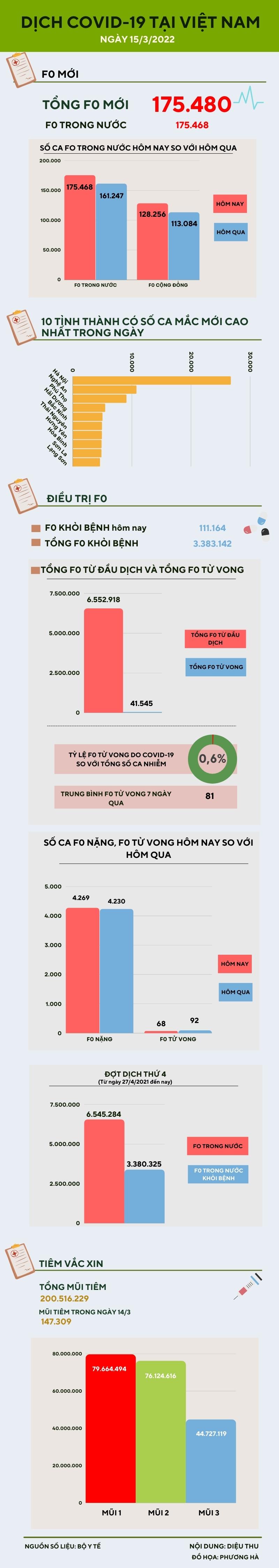 : TVO 24H: 2022-03-15 18:45:13 Lượt xem: 2379 Ngày 15/3: Ghi nhận 175.468 ca COVID-19 trong nước, 111.164 người khỏi bệnh Bộ Y tế cho biết, trong 24 giờ qua đã ghi nhận 175.468 ca COVID-19 trong nước (tăng 14.221 ca so với ngày trước đó). Theo Diệu Thu (Tạp chí Du lịch TP.HCM)