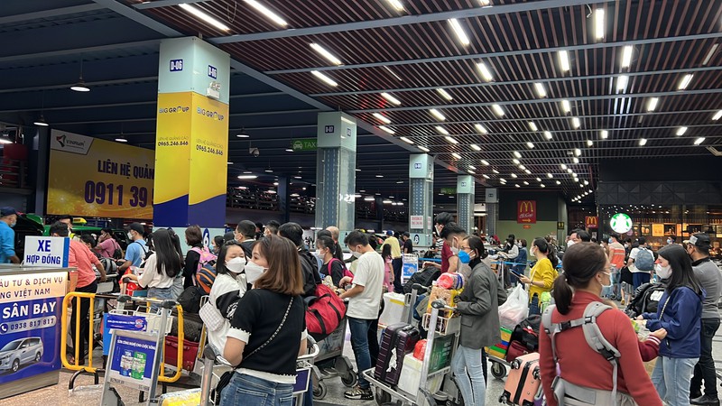 Hành khách xếp hàng chờ taxi ở sân bay Tân Sơn Nhất. Ảnh: ĐÀO TRANG.